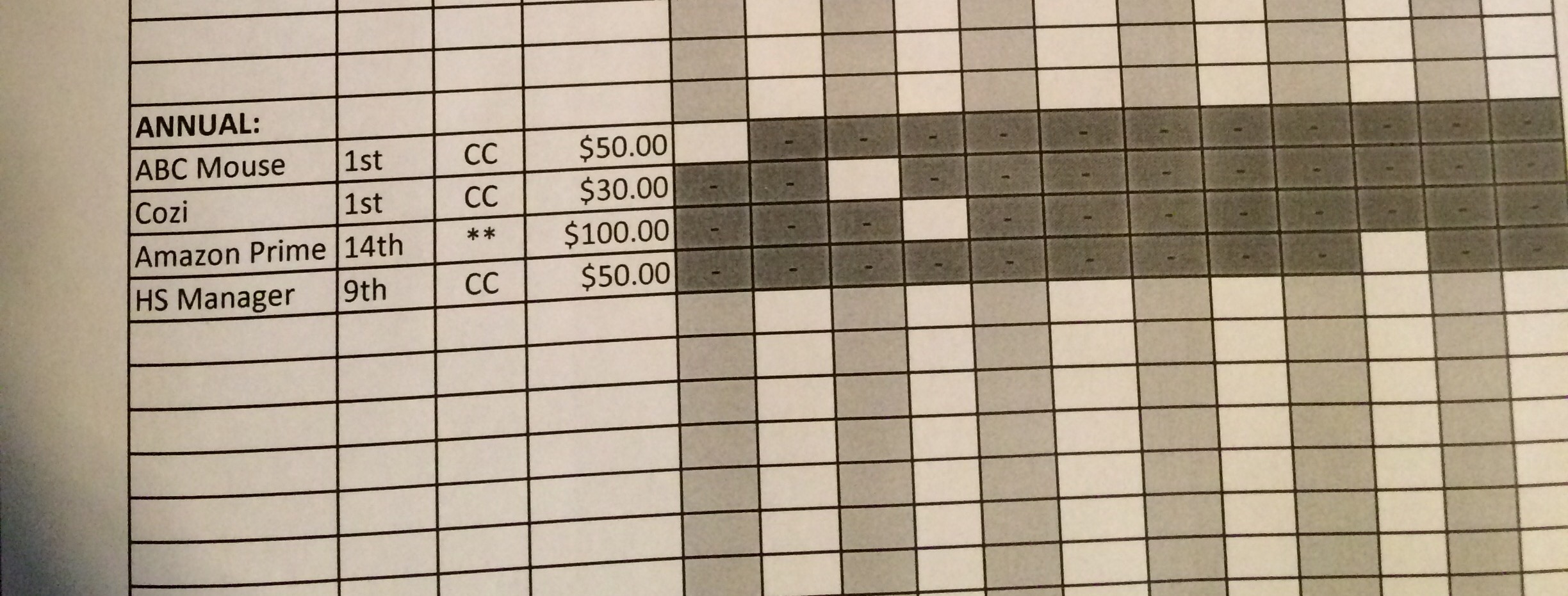 This next picture shows the annual subscription payments that I currently have. This serves as a reminder for me to evaluate whether I really need/want to keep these services before the due date. I do have them set up to charge to my credit card but by knowing when they are due I can try to be prepared to pay them off when they come due.