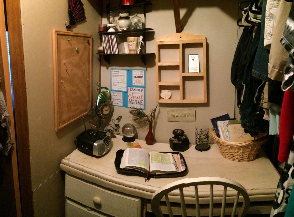 I desire to have more of these moments and experiences in the near future. I know that now I have a place where I can truly ‘be still’ and listen for His voice. It is His voice of wisdom that I have been so desperately seeking and that my heart yearns for. I long to hear Him whisper the promises of His love and His plans for me. Now I have a private place to meet with Him. I left my closet with a happy heart!