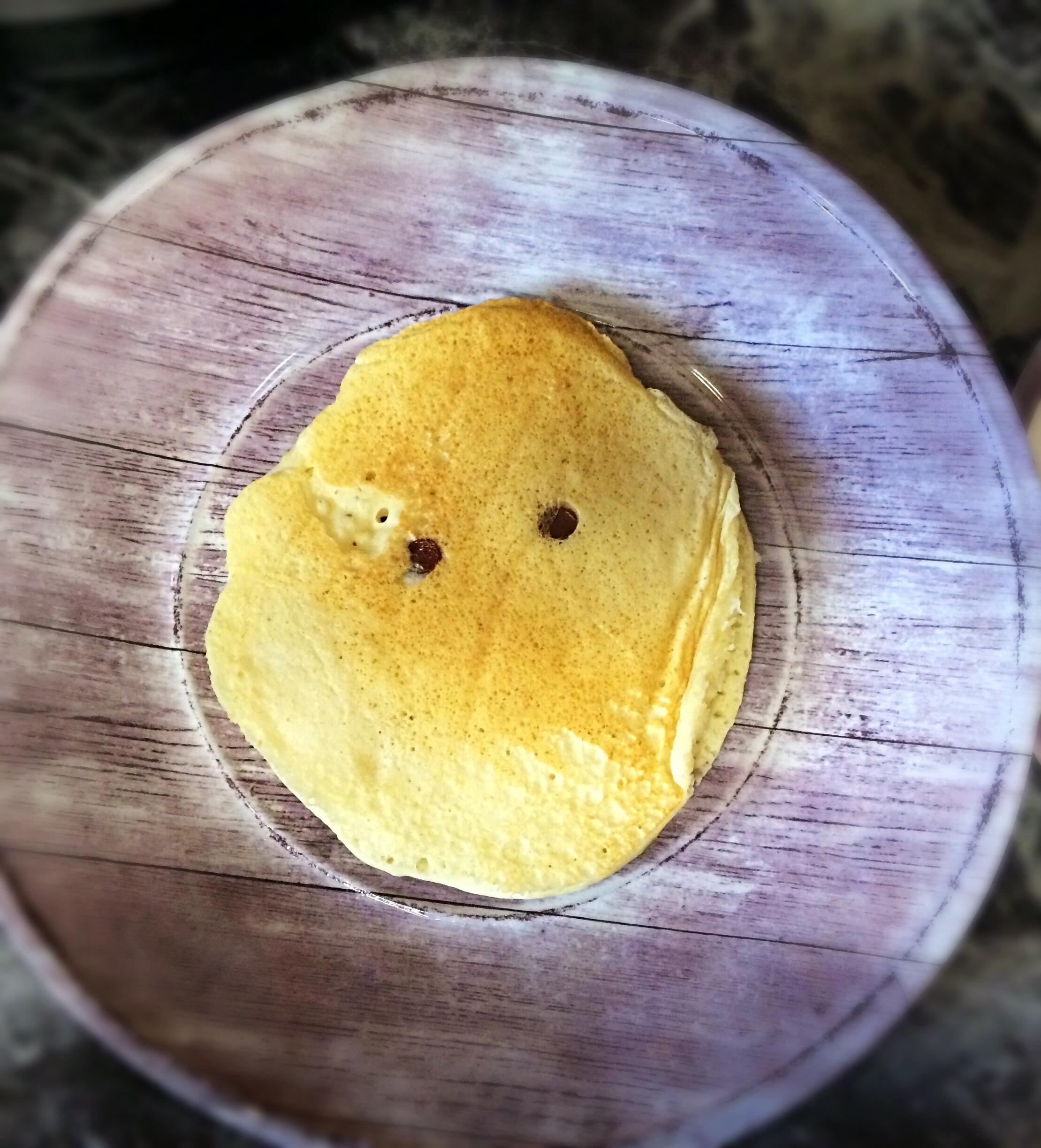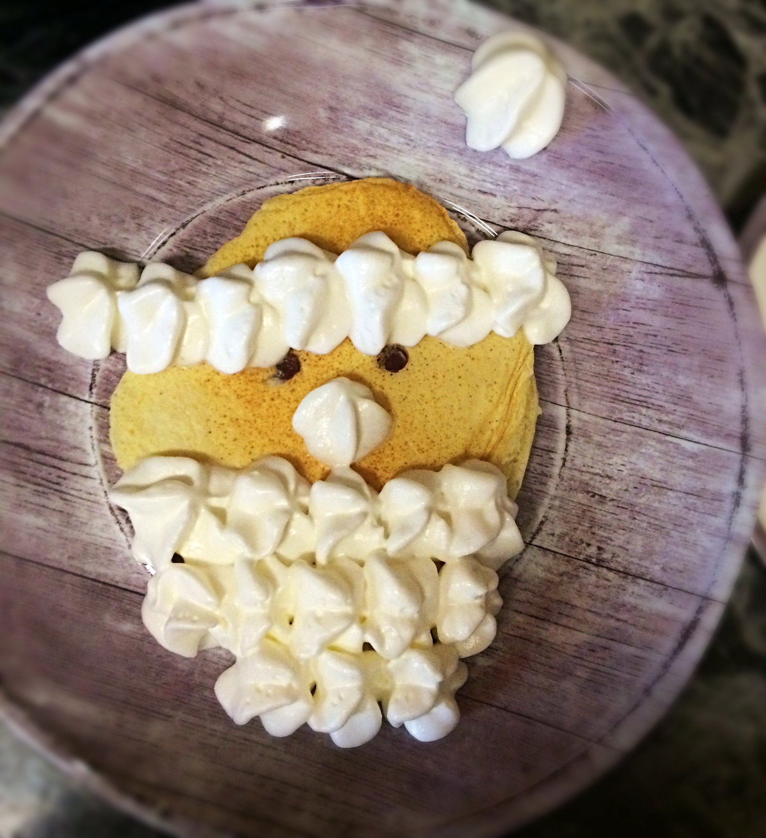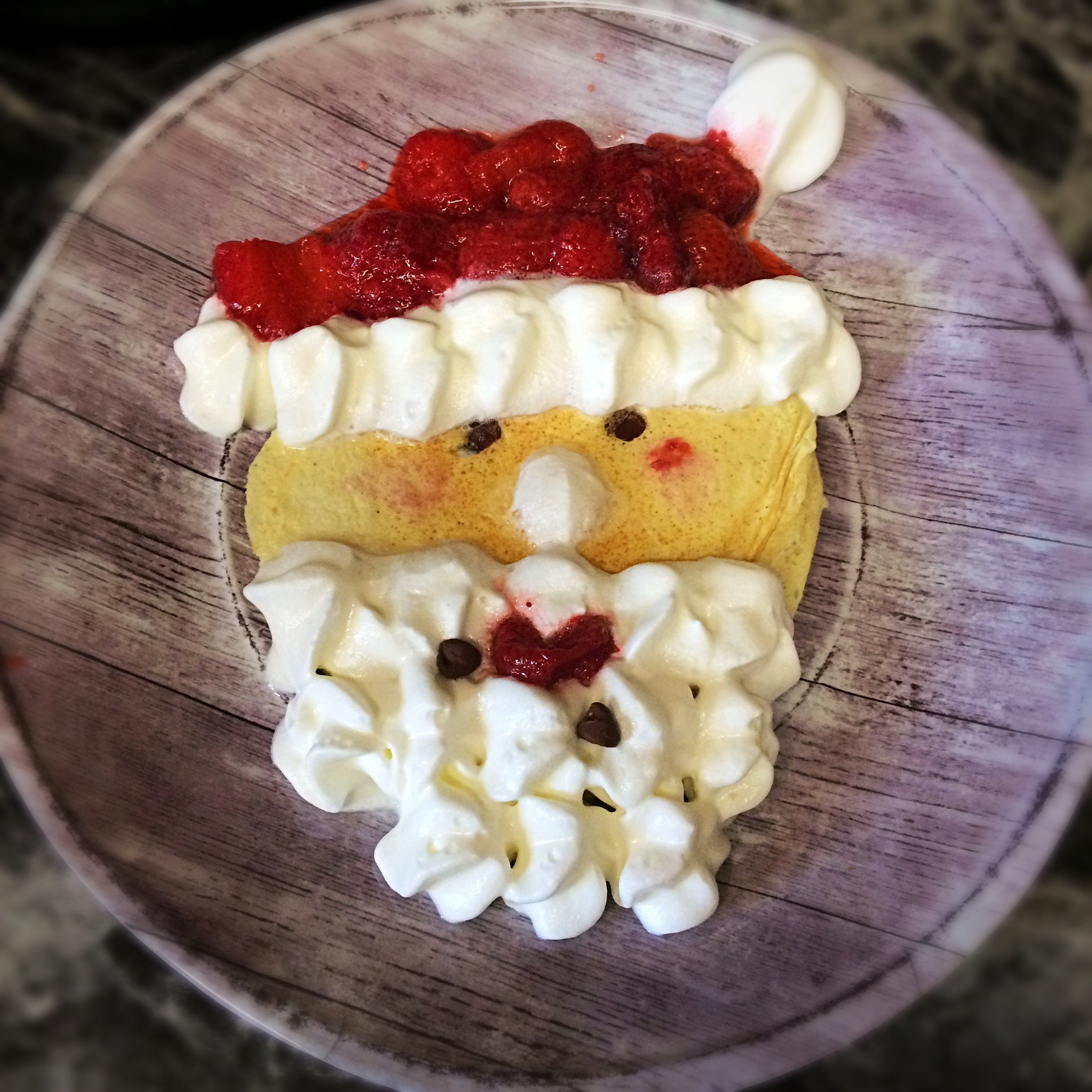 This year I added the chocolate chips to the pancakes while on the griddle for our Santa Claus PancakesI forgot to pick up some fresh strawberries and blueberries so we made do with what we had here. I also didn’t realize that Mr. Jacob had added a couple of extra chocolate chips to Santa’s beard… lol!